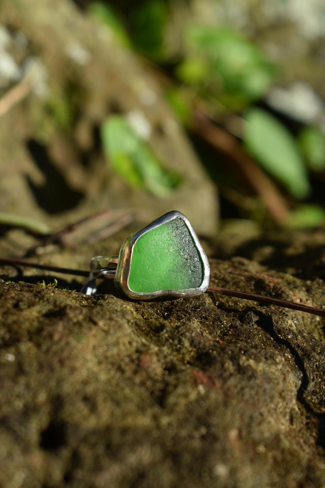 A gorgeous green seaglass ring with a thick hammered band. Ring is made with sterling silver. Seaglass is found on the island of Kauai.